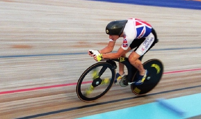 Крис Бордман на своем супер-велосипеде Lotus во время олимпийских игр 1992 года в Барселоне, Испания.
