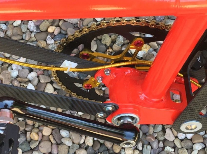 Седло, подседельный штырь, вилка и руль карбоновые. Титан используется в каретке, цепи, спицах, педалях, пружине подвески и «каждой гайке, болте и шайбе». Крэйндж облегчил все, что можно, с учетом предела прочности, с точностью до десятой доли грамма.